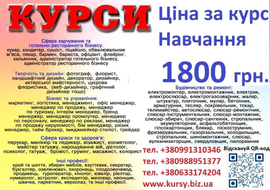 Курси перукар, манікюр, кухар, зварник, електрик, слюсар, токар, тесляр, візажіст, нарощування вій, тату, маркетинг, логістика, корекція брів вій, піццеола, крою та шиття, телемайстер, автослюсар, слюсар ремонтник, слюсар інструментальник, слюсар монтажник, слюсар збирач , автоколоріст, муляр, аніматор, грумінг, шугарінг, татуаж, зборщик меблів, плиточник, бухгалтер, секретар, слюсар сантехнік, акумуляторникк, асфальтобетонщик, холодильщик, гипсокортонщик, стропальник, фотограф, діетолог, пилорамник, прогаміст, бармен, озеленювач, бляхар, шліфувальщік, плодоовочевод, офіціант, мерчендайзер, охоронець, пекар, барист, продавець, флористика, сушіст, взуттєвик, обвальщик м"яса, декоратор, кінолог, пескострумнник, фрезерувальник, газорізальник, зуборізальник, психолгія, кондитер, масажист, ювелір, косметол, арматурник, маляр, штукатур, електромонтажник, покрівельник та інші. Диплом та сертифікат.