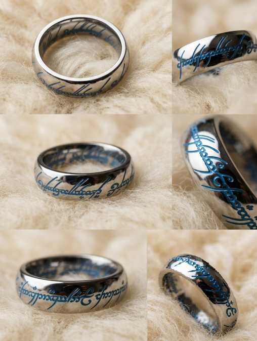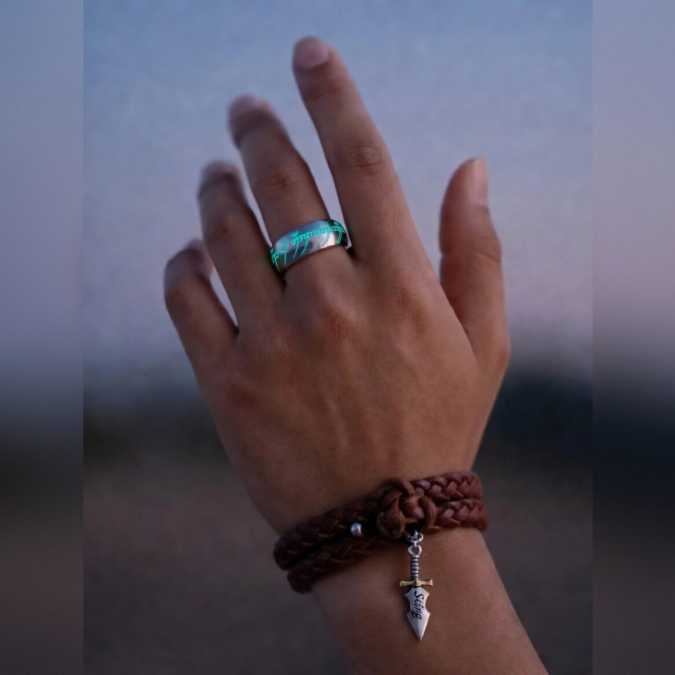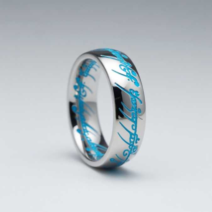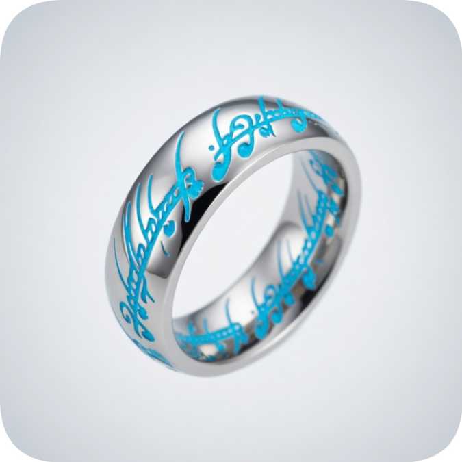 Стильная современная интерпретация легендарного кольца: днём — строгий металлический обод с надписью тенгвара, вечером после зарядки светом или UF‑фонариком из комплекта — мягкое благородное свечение Tiffany Blue, как отблеск фиала Галадриэли.